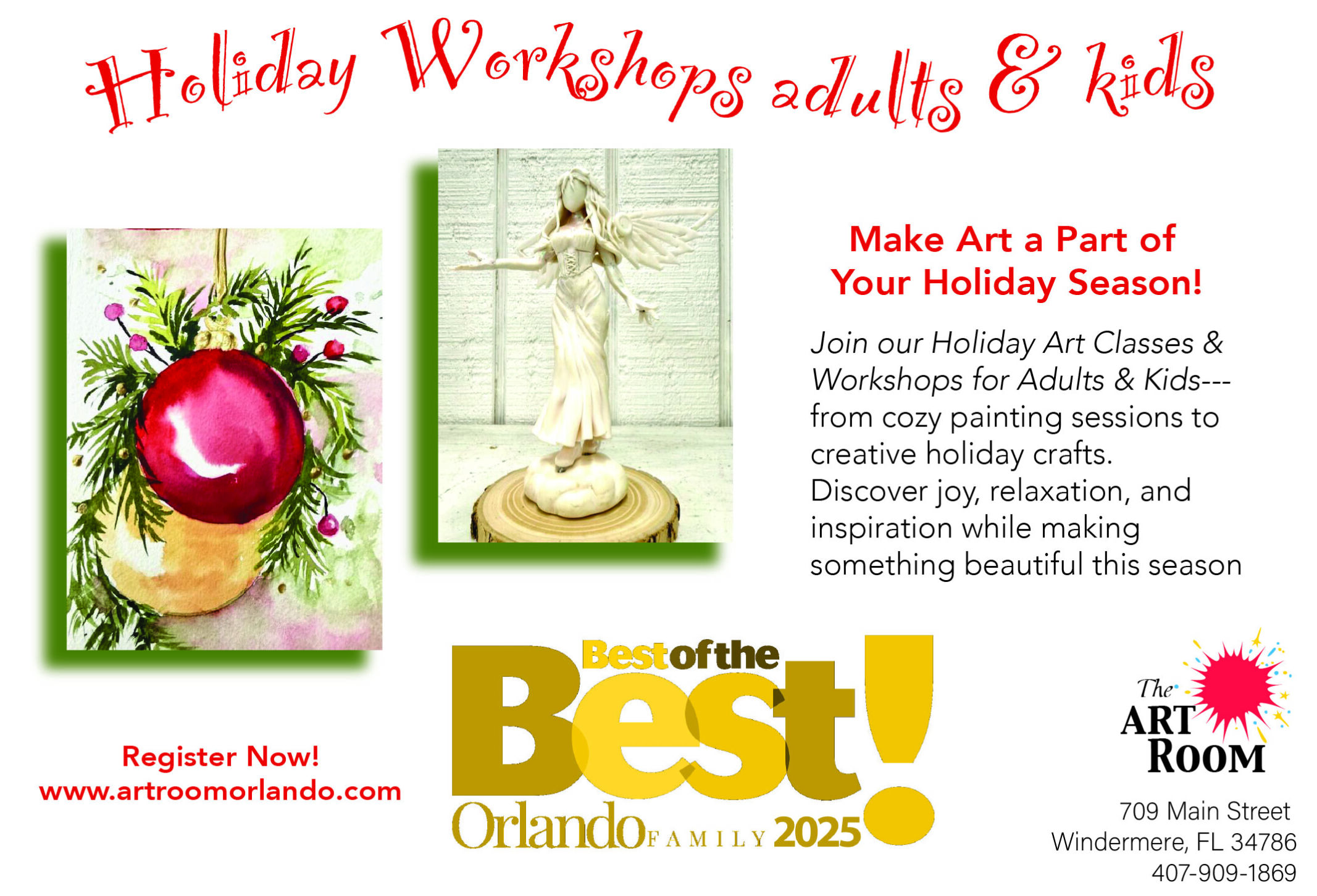The Art Room offers a wide range of art classes for Beginners to Advanced Artists, in the Windermere/Orlando area. Our art classes include Oil Painting, Acrylic painting, Watercolors, Portraits, Mosaics, Collage, Drawing, Kids and High School Sculpture, Homeschool Classes, Mommy & Me and so much more! Additionally, visiting artists and a variety of holiday workshops are added bonuses to our schedules.